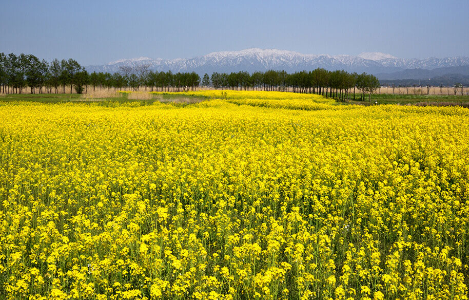 新潟市北区福島潟の菜の花畑から望む五頭連峰。