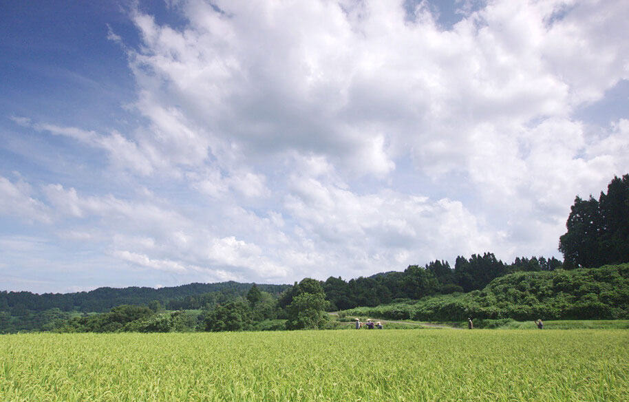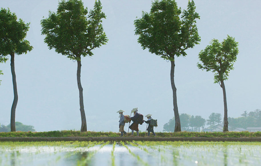 夏の蒼蒼した田畑の中を旅するハル、テイ、ハナヨの3人の瞽女姿。