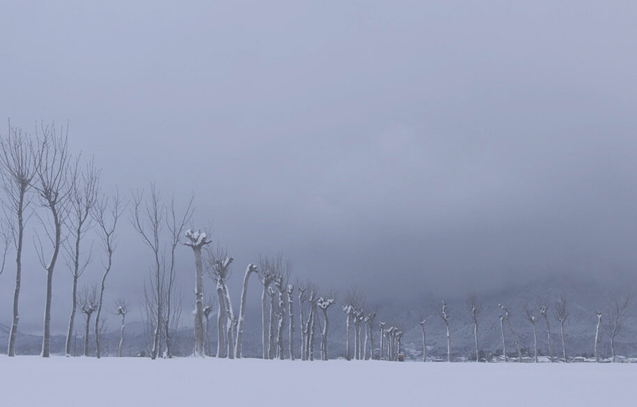真冬の吹き荒れる雪の中をフジ、コイ、クニ、ハルが必死に旅をするシーン。