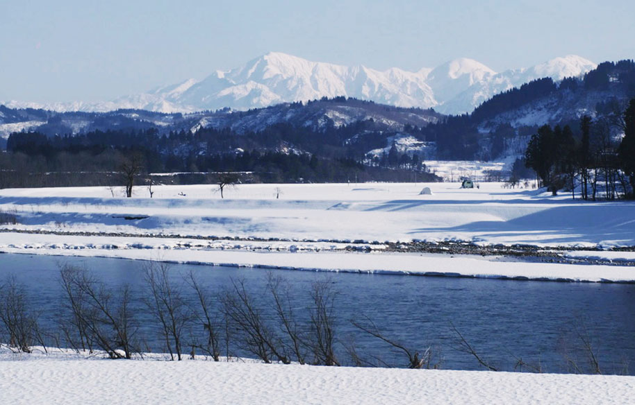 凍てつく真冬の信濃川に向かって、ハルが大声で瞽女唄を歌う寒声稽古シーン。