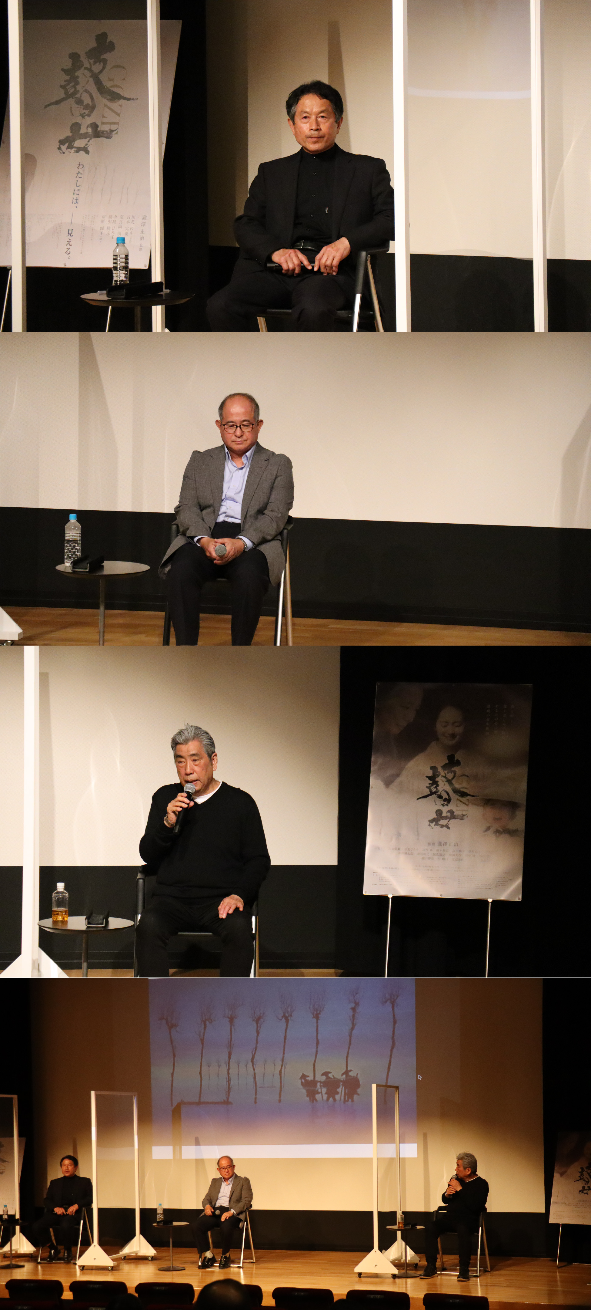 画家:渡部等さん・詩人:国見修二さんと瀧澤監督が 瞽女を通じての出会いを楽しく語り合いました。 終了後、監督に感動したと感想を伝えるお客様もいました。 その時の写真をアップいたします。